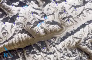 | Kanjut Sar | ۷٬۷۶۰ | ۲۵٬۵۵۸ | ۳۶°۱۲′۱۸″ شمالی ۷۵°۲۵′۰۴″ شرقی | ۱٬۶۹۰ | Khunyang Chhish | ۱۹۵۹ | ۲ (۱) |