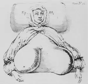 | اولین نمونه هیپرتروفی پستان که با باد کردن و بزرگشدن بیش از حد پستان زنی ۲۳-۲۴ ساله در موردی بسیار نادر در سال ۱۶۶۹-۱۶۷۰ میلادی به ثبت رسیده بود. پزشک دارستون این نمونه را برای ثبت این واقعه رسمکرده بود که بیمار چندی بعد در اثر همین بیماری درگذشت.[1] | |