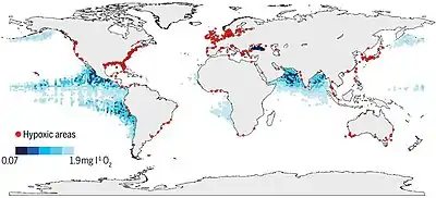 نقشهٔ جهانی سطح اکسیژن «کم» و «رو به زوال» در اقیانوس باز و آبهای ساحلی.[1] این نقشه سایتهای ساحلی را نشان میدهد که در آن مواد مغذی انسانی باعث تشدید یا کاهش اکسیژن به <۲ میلیگرم در لیتر (<۶۳ میکرومول در لیتر) (نقاط قرمز) شدهاست؛ و همچنین مناطق حد اقل اکسیژن اقیانوس در ۳۰۰ متر (مناطق آبی سایهدار).[2]جستارهای وابسته