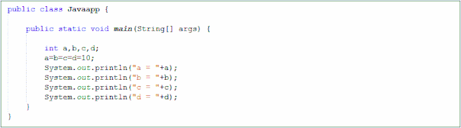 عملگر مقداردهی (=) در اکثر زبانهای برنامهنویسی دستوری با وابستگی راست تعریف شدهاست. همچنین مقداردهی به صورت یک اصطلاح تعریف میشود. تفاوت اصطلاح با عبارت این است که اگر در انتهای یک اصطلاح ; اضافه کنیم، به عبارت تبدیل میشود. در نتیجه امکان مقداردهی زنجیرهای به وجود میآید و مقدار یک مقداردهی به عنوان ورودی به یک مقداردهی دیگر داده میشود.