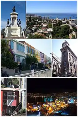 ![]() Valparaíso. Clockwise: Monument to the Heroes of Iquique, view from La Sebastiana; house of پابلو نرودا، Turri clocktower, Valparaíso city landscape at night, Concepción Hill funicular, Atkinson street. | |