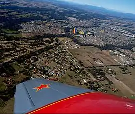 ![]() Aerial view from the north-west, Hume Freeway bypass somewhere around top, One and Three Mile creeks meeting around the middle. | |||||||||