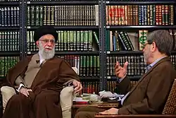 سید علی خامنهای همراه با علیرضا مرندی وزیر اسبق بهداشت و رئیس فرهنگستان علوم پزشکی هنگام ضبط پیام تشکر از زحمات پزشکان و پرستاران.[1]