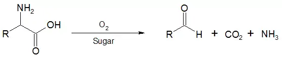 در اولین واکنش یک α-اسید آمینه بر اثر اکسایش و انجام مرحله ی کربوکسیل زدایی موجب تشکیل یک گروه آلدهید در موقعیت α سابق، می گردد. این واکنش توسط حرارت و با کمکاکسیژن در حضور یک قند کاهنده انجام میگیرد.[1][2][3]