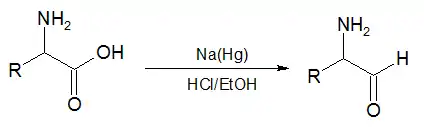 در دومین نوع واکنش یک α-اسید آمینه یا استر از آن، با کمک کاهش توسط ملغمه ی سدیم و اسید هیدروکلریدریک اتانولی منجر به تولید یک آلفا آمینو آلدهید می گردند.[4][5]
