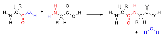 واکنش دو آمینو اسید و تشکیل یک پیوند پپتیدی (قرمز)، در این واکنش یک مولکول آب نیز به وجود میآید