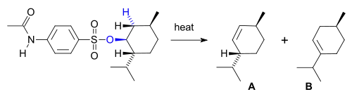 - به antiperiplanar نیاز نیست. یک نمونه: گرماکافت یک سولفونات استر ویژه با منتول: