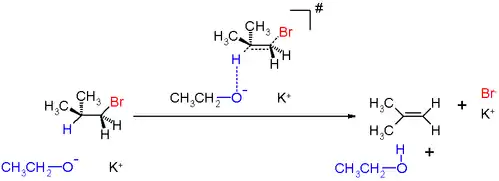 واکنش ایزوبوتیلبرمید با پتاسیماتوکسید در اتانول که در بالا نشان داده شدهاست، یک نمونه واکنش E2 است. محصول این واکنش ایزوبوتیلن، اتانول و پتاسیم برمید است.