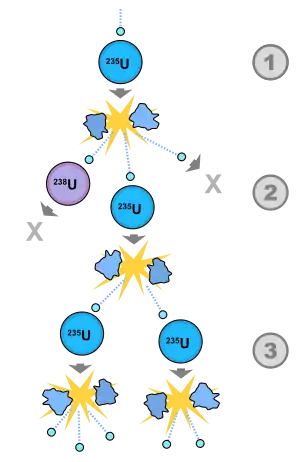 ۰۳ این دو نوترون با اتم اورانیوم ۲۳۵ برخورد میکنند، که از ۱ تا ۳ نوترون تقسیم و آزاد میشوند، و هنوز هم ادامهٔ واکنش میتواند حفظ شود
