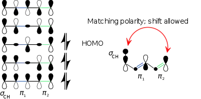 در یک جابهجایی گرمایی [۳،۱] هیدرید، یک اتم هیدروژن به صورت یک یون هیدرید در طول یک سیستم سه اتمی حرکت میکند. مطابق قوانین وودوارد–هافمن این انتقال بهصورت دورخی انجام میشود. اگرچه چنین انتقالی، همانطور که قوانین وودوارد–هافمن اعلام میکنند، از لحاظ تقارنی و همپوشانی اوربیتالی مجاز است، اما برای چنین انتقالی به یک توپولوژی تابخورده مانند نوار موبیوس (به انگلیسی: Mobius topology) نیاز است که اتخاذ چنین آرایشی برای یک اتم هیدروژن، بهخاطر کوچکی بیش از حد ابعاد اتم و دامنه پوشش اوربیتال مستقر بر روی آن (اوربیتال s)، غیرممکن است.[4]
