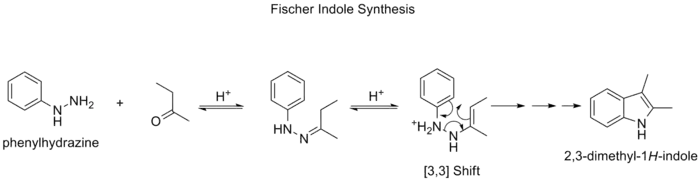 سنتز ایندول فیشر روشی شناخته شده در تولید یک ایندول با استفاده از پیشمادههای فنیل هیدرازین و آلدهید (یا کتون) در شرایط اسیدی است. [15] [16] این واکنش که در سال ۱۸۸۳ توسط هرمان امیل فیشر کشف شد از جمله واکنشهایی است که طی آن شاهد انجام یک واکنش جابهجایی سیگماتروپی [۳،۳] هستیم.