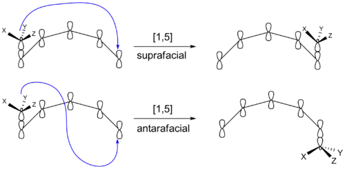 یک جابهجایی [۵،۱] شامل انتقال یک اتم/گروه (هیدروژن، آلکیل یا آریل) در طول یک سیستم پنج اتمی پای است. این نوع انتقال بهصورت تکرخی و بدون نیاز به چرخش توپولوژی انجام میشود. زمانیکه توپولوژی اتخاذ شده در زمان انتقال بدون تابخوردگی باشد، اصطلاحاً به آن توپولوژی هوکل (به انگلیسی: Hückel topology) گفته میشود.