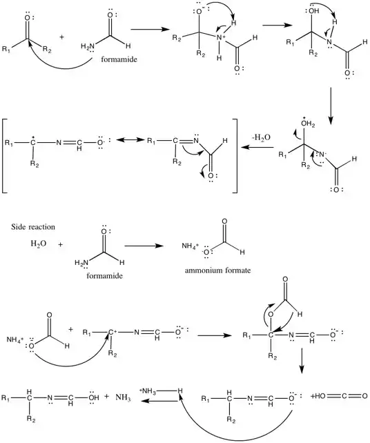 The scheme depicts the mechanism for the Leuckart reaction using formamide as the reducing agent.
