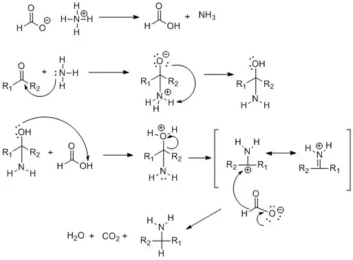 The mechanism depicts the conversion of ketone (or aldehyde) to an amine using ammonium formate as a reagent.
