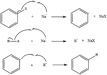 به صورت کلی دو روش اصلی بریا توصیف سازوکار انجام واکنش وجود دارد.[8][9] در روش اول، ابتدا با مداخله سدیم، گونه رادیکالی آریل و آلکیل تشکیل میشود و در مرحله بعد این دو گونه رادیکالی با یکدیگر تشکیل یک پیوند کربن-کربن جدید را میدهند.