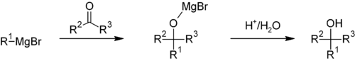 محلول یک ترکیب کربونیلدار به یک واکنشگر گرینیارد اضافه میشود.
