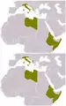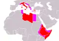 نقشهٔ ایتالیا (سبز) در تابستان ۱۹۴۲و نواحی تحت کنترل بریتانیا (قرمز)