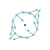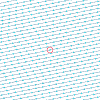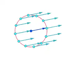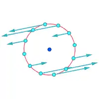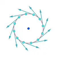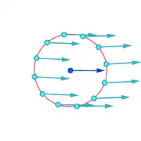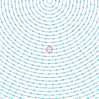 | v نماد سرعت جریان، r نماد فاصله از مرکز ورتکس و ∝ تناسب است. سرعتهای مطلق در نقاط مشخص شده: | ||