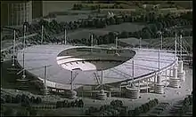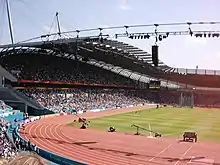 سقف جایگاههای جنوبی، شرقی و غربی که برای پیکرهبندی ورزشی استادیوم طراحی شده بود، به وسیله سیستم شبکه کابلی حفظ میشد. جایگاه موقت قرار گرفته در انتهای شمالی در اطراف تیرها ساخته شده بود و کابلهایی را که در نهایت سقف جایگاه شمالی فعلی را مستحکم میکردند، به زمین متصل میکرد.[33] بعد ار بازی مسیر دو و میدانی خارج میشد. سکوی موقتی که در انتهای شمالی قرار داشت، حذف شد و جایگاه شمالی و ردیف پایینی صندلیها بر روی یک خاکبرداری آماده قرار گرفت. جایگاه شمالی با افزودن رفترها پرلینها و روکش تکمیل شد.[33] این تغییر حدوداً یک سال به طول انجامید[33] و ظرفیت ورزشگاه را تا ۱۰۰۰۰ صندلی افزایش داد.[25]