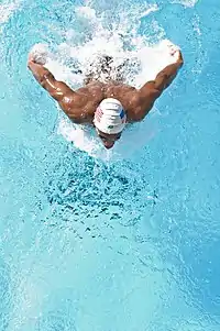 شنای پروانه ==== در تمام طول مسابقه (به جز در هنگام برگشت) بدن شناگر باید بر روی سینه قرار داشته باشد و از آغاز نخستین دستی که پس از استارت و برگشتها زده میشود شانهها با سطح آب در یک راستا باشند.