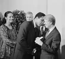 ![]() خانم ورونیکا پورشه علی و محمد علی در کاخ سفید در سال ۱۹۷۷ (میلادی) | |