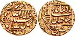 ![]() سکه طلایی شاه جهان امپراتور مغلی، موزیم ملی افغانستان، کابل. |
