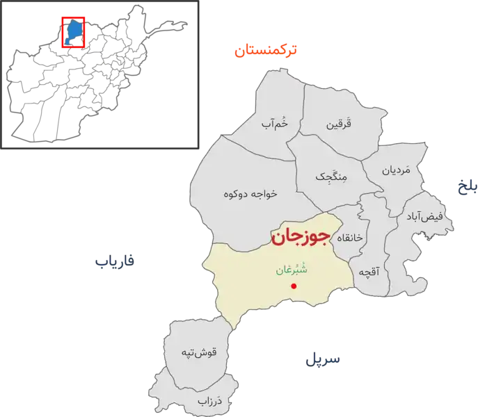 - Wikipedia contributors, "Jowzjan Province," Wikipedia, The Free Encyclopedia, http://en.wikipedia.org/w/index.php?title=Jowzjan_Province&oldid=207142791