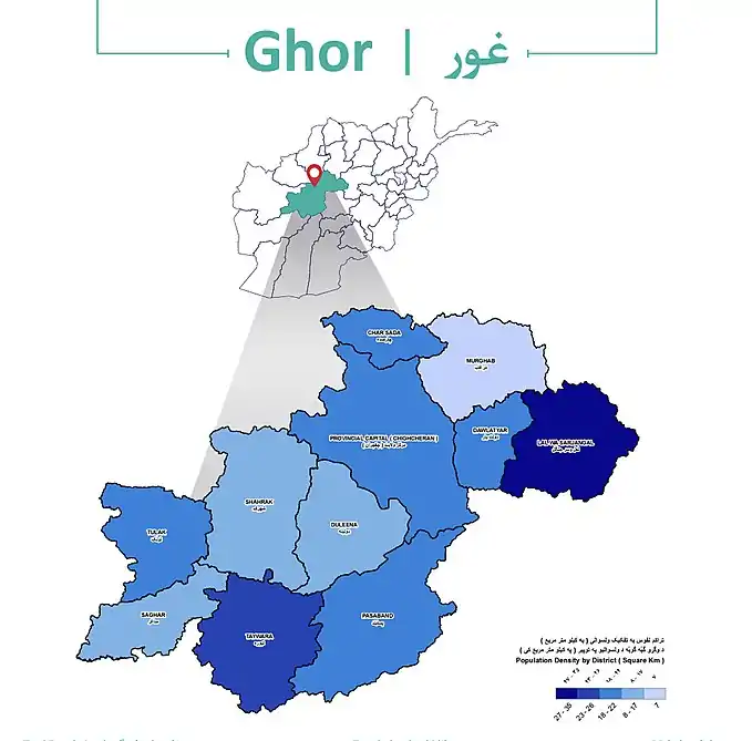 ولسوالی مرغاب روی نقشه ولایت غور. مرغاب منطقه وسیع در شمال شهر فیروزکوه است که در سال ۱۳۹۸ به حیث یک واحد اداری جدید تأسیس شد. | |