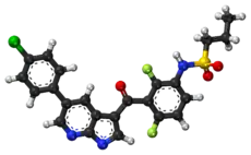 ![]() ساختار B-Raf با استفاده از روش بلورشناسی پرتو ایکس (N-ترمینال = آبی، C-ترمینال = قرمز) در ترکیب با «ومورافنیب» (کُرهها، کربن = سفید، اکسیژن = قرمز، نیتروژن = آبی، کلورین = سبز، فلئورین = آبی دریایی، سولفور = زرد).[1] | |