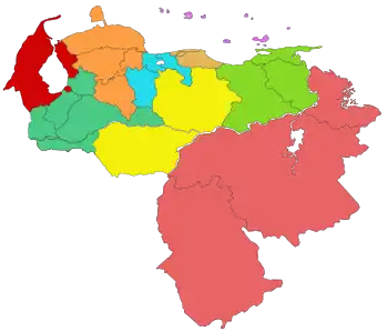 ایالتهای ونزوئلا به نه مجموعه اجرایی تقسیمبندی میشوند که با حکم ریاست جمهوری تشکیل میشوند. مناطق به همراه ایالات مربوطه در فهرست زیر آورده شدهاند: