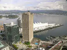 یکی از المانهای مهم و مشهور از چشمانداز شهر ونکوور، یک سازهٔ عظیمِ غشایی (چادری) به نام کانادا پلِیس (Canada Place) (طراحی شده توسط زیدلر رابرتس- رابرتس پارتنرشیپ، MCMP و DA Architects)است که قبلاً یک نمایشگاه بودهاست و برای اکسپو ۸۶ استفاده میشد. این سازه شامل بخشی از Convention Centre، هتل پن پسفیک و یک پایانه کشتیهای کروز و تفریحی است. دو ساختمان مدرن دیگر که بخش جنوبیِ خط افق شهر را از بقیه بخشهای مرکز شهر ونکوور متمایز میسازد، ساختمان شهرداری و بیمارستان عمومی ونکوور است که هردو توسط فرد تاونلی و متسن در سالهای ۱۹۳۶ و ۱۹۵۸ ساخته شدهاند.[97][98]