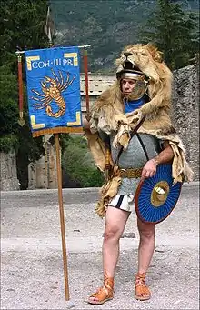 یک نمایشدهندهٔ امروزی در قالب یکی از اعضای گارد امپراتوری وکسیلومی را با نشان عقرب در دست گرفتهاست. این وکسیلوم نماد پرتورینها و نشانهٔ احترام آنها به امپراتور تیبریوس بود که کمپ پرتورین را در رم ساخت. عقرب علامت نجومی تیبریوس بود.