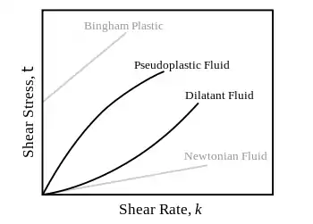 نمودار تنش برشی بر حسب کرنش برای سیالات نیز نقش اساسی ایفا میکند و در کنار یکی دیگر از نمودارهای پرکاربرد یعنی نمودار تنش برشی بر حسب نرخ برش، از مهمترین روشها برای دستهبندی سیالات بهشمار میروند. در سادهترین حالت و برای تعدادی از سیالات مشهور و پر استفاده مانند آب و هوا، تغییرات منحنی تنش برشی بر حسب نرخ برش، به صورت خطی است. به این دسته از سیالات، سیالات نیوتنی گفته میشود. برای سایر سیالات پیچیدهتر، تغییرات نرخ کرنش نسبت به تنش برشی اعمال شده غیرخطی یا به صورت کشسان است. بهطور تاریخی، به این دسته از سیالات که رفتاری متفاوت با سیالات نیوتنی دارند، سیالات غیرنیوتنی میگویند. بهطور دقیقتر، با توجه به تقعر منحنی تنش برشی بر حسب نرخ برش، سیالات غیرنیوتنی، خود به دستههای متعدد دیگری تقسیم میشوند. یکی از جالبترین دستههای سیالات غیرنیوتنی، تیکسوتروپیکها هستند؛ در این سیالات با وجود ثابت ماندن تنش برشی نسبت به نرخ کرنش، با گذشت زمان ویسکوزیته کاهش مییابد؛ یعنی استمرار وجود یک تنش برشی ثابت بر سیال، به مرور زمان باعث کاهش یافتن ویسکوزیته آن میشود. همچنین وقتی تنش برشی تغییر میکند، تیکسوتروپیکها از قلمرو سیال بودن خارج میشوند و رفتارهای کشسان از خود نشان میدهند. بسیاری از مواد ویسکوالاستیک رفتاری شبیه به لاستیکها و از جمله مواد کائوچویی دارند و توضیح رفتار آنها توسط نظریه ترمودینامیکی کشسانی پلیمرها صورت میگیرد. در واقعیت تمام مواد به شکلهای گوناگون از قانون هوک انحراف دارند؛ برای مثال بسیاری از مواد در عین این که رفتار لزج گونه از خود نشان میدهند، خواص کشسان نیز دارند. مواد ویسکوالاستیک از جمله موادی هستند که در آنها رابطه میان تنش برشی و کرنش، وابستگی شدیدی نسبت به زمان دارد. کشسان نبودن مادهای که جامد تلقی میشود، نشانهای از ویسکوالاستیک بودن آن است؛ به معنا که به هنگام وارد شدن تنش، وضعیت تعادلی خاصی پیدا میکنند و با برداشته شدن آن در نهایت بهطور کامل شکل اولیه خود را بازمییابند. برخی از پدیدههای مهم در مواد ویسکوالاستیک عبارتاند از: