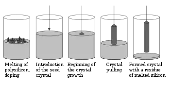 پس از آن شمش بدست آمده را با کمک ارّهٔ سیمی، برش و سپس پولیشکاری و جلا میدهند تا به شکل دلخواه درآید.[6] اندازهٔ ویفرها برای کاربرد فتوولتاییک میان ۱۰۰ تا ۲۰۰ میلیمتر (مربعی) و ضخامت آنها ۲۰۰ تا ۳۰۰ میکرومتر است. البته قرار است که در آینده ضخامت ۱۶۰ میکرومتر، ضخامت استاندارد تعیین گردد.[7] در الکترونیک از ویفرهایی به قطر ۱۰۰ تا ۳۰۰ میلیمتر بهره برده میشود. بزرگترین ویفر ساخته شده تاکنون ۴۵۰ میلیمتر قطر داشته که هنوز به خط تولید نرسیدهاست.