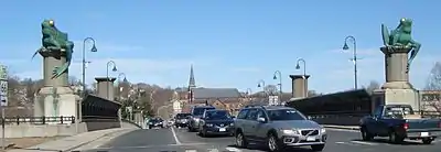 مجسمههای بزرگ قورباغهها و قرقرههای ریسندگی بر روی پل اصلی ویلیمانتیک