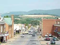 ![]() Downtown Waynesboro showing Main Street, as well as the scar on the mountain prior to being seeded. The Wayne Theatre (under restoration) is visible at the extreme left of the photo. | |