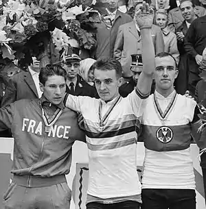 ![]() Francis Bazire, Flaviano Vicentini and Winfried Bölke at the 1963 UCI Road World Championships | |||||||||||||