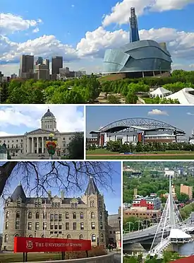 ![]() Clockwise from top: Downtown featuring the Canadian Museum for Human Rights, ورزشگاه اینوستورز گروپ فیلد، Saint Boniface and the Esplanade Riel bridge, Wesley Hall at the University of Winnipeg, Manitoba Legislative Building. | |
