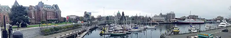 ![]() بر خلاف عقربههای ساعت از بالا چپ: ورودی فرودگاه ویکتوریا هاربر (بریتیش کلمبیا), مجمسه ملکه ویکتوریا، Fisgard Lighthouse, ساختمان پارلمان بریتیش کلمبیا معماری نئو باروک، ساختمان پارلمان بریتیش کلمبیا، هتل امپریس، و کلیسای جامع مسیح. | |