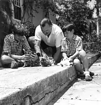 ![]() Hemingway with father ارنست همینگوی (center), brother Gregory (right) and kittens in Cuba | |