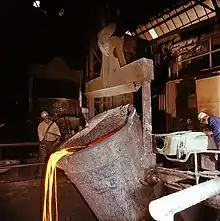 فلز گداخته که با پاتیل به درون قالب ریخته میشود.