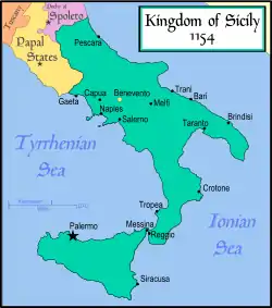 ![]() پادشاهی سیسیل در زمان مرگ مؤسس آن، راجر دوم سیسیل، در ۱۱۵۴ | |||||||||