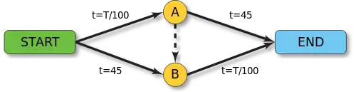 در شکل روبرو اعداد نوشته شده روی خطوط شبکه مدت زمانی را که رانندگان در ترافیک میمانند؛ نمایش میدهد. برای مثال مدت زمانی را که یک راننده در مسیر نقطه آغاز به سمت نقطه B در ترافیک میماند برابر ۴۵ دقیقه و مدت زمانی را که یک راننده از نقطه شروع به سمت نقطه A حرکت میکند بر حسب اینکه چه تعداد اتومبیل از این مسیر استفاده میکنند؛ برابر است. به عنوان مثال اگر از این مسیر تعداد ۲۰۰۰ ماشین عبور کند مدت زمانی که طول میکشد هر راننده از نقطه آغاز به نقطه A برود برابر دقیقه است. برای مثال اگر T برابر ۴۰۰۰ راننده باشد که بخواهند از نقطه آغاز به نقطه پایان بروند در بهترین حالت نیمی از رانندگان مسیر بالا و نیم دیگر مسیر پایین را انتخاب میکنند. در این حالت مدت زمانی که طول میکشد هر راننده از مبدأ به مقصد برسد زمانی برابر ۶۵ دقیقه است.