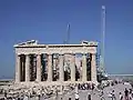 معبد پارتنون در بلندترین نقطه آکروپولیس به آتنا وقف شدهاست. واژهٔ پارتنون از پارتنوس یونانی به معنی باکره میآید. آتنا، گاه آتنای پارتنوس نیز اطلاق میشود. پارتنون که هنوز پابرجاست، بین ۴۷۷_۴۳۲ پیش از میلاد ساخته شد و مجسمههایش را فیدیاس طراحی کردهاست.[1]