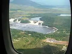 View from inbound plane of Canaima Lagoon, Saltos Golondrina, Saltos Ucaima and the airstrip