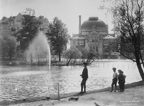 پارک کایسانیمی در سال ۱۹۱۲. تئاتر ملی فنلاند در پس زمینه عکس مشخص است.