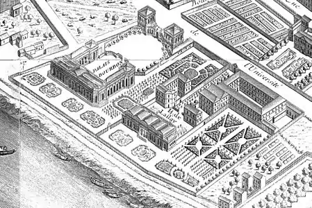 پالایس بئوربون (بالا سمت چپ) و هتل د لاسای (پایین سمت راست)، اثر در نقشهٔ تیوگوت پاریس (۱۷۳۹)