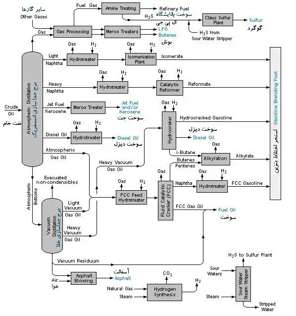 در شکل پروسسهای معمول در یک پالایشگاه نفت نشان داده شدهاست. پالایشگاههای نفت شامل واحدهای پروسس مختلفی است که در ذیل به توضیح مختصر هر یک از موارد میپردازیم: