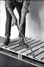 پالت Stringer با استفاده از یک قاب از سه یا بیشتر به صورت موازی قطعه چوب (به نام stringers). بالا deckboards سپس ضمیمه شده به stringers برای ایجاد پالت ساختار. Stringer پالت میتوانید یک درجه کاهش به آنها اجازه میدهد «چهار راه» ورود. لیفتراک میتواند یک نوازنده پالت از هر چهار جهت هر چند بلند کردن اجسام توسط stringers امن تر است.[14]