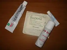 - هیدروکلویید: پانسمان پیشرفته که با ایجاد یک محیط مرطوب و جذب مقدار زیادی از ترشحات به بهبود زخم کمک میکند. به شکل صفحات حاوی ماده و نیز شکل خمیری موجود است و در رشد بافت گرانوله عامل مهمی است. در صورت وجود اگزودا با جذب مایع و تولید ژل بهبود زخم را سرعت بخشیده و برای جراحت عمیق بکار نمیرود و مؤثر در ضایعات سطحی است.[7]